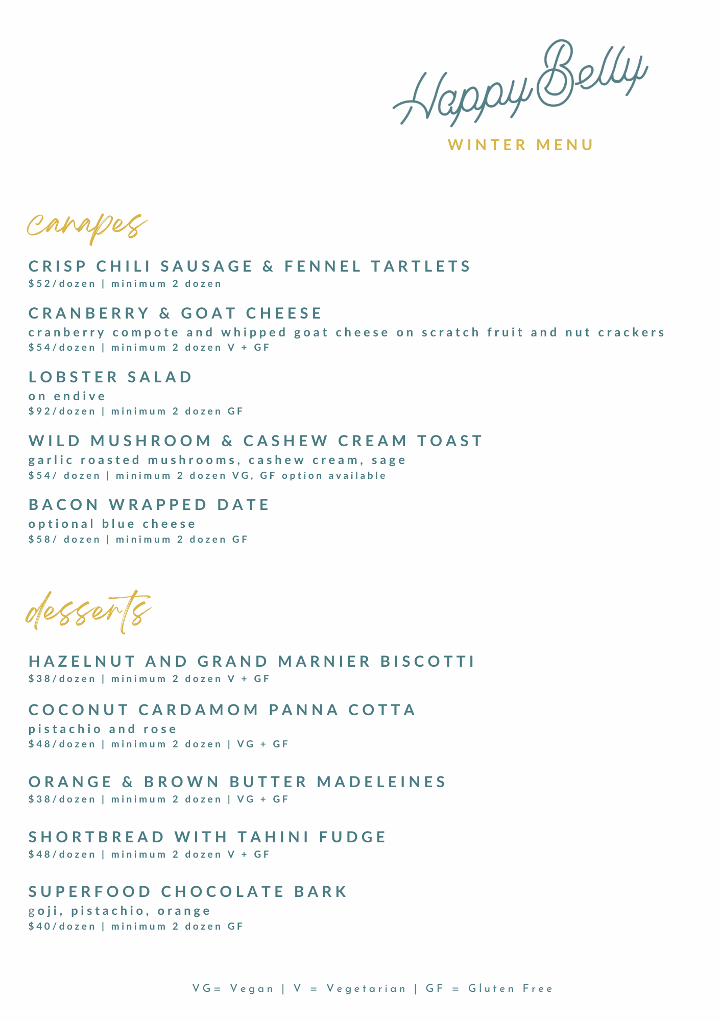 Hosting a holiday gathering or a special celebration? Let Happy Belly handle the cooking! Our seasonal menu is designed to delight your guests with fresh, flavorful dishes that make any occasion memorable. We offer options to meet a variety of dietary needs, and we’re happy to accommodate any specific allergies or preferences—just let us know!